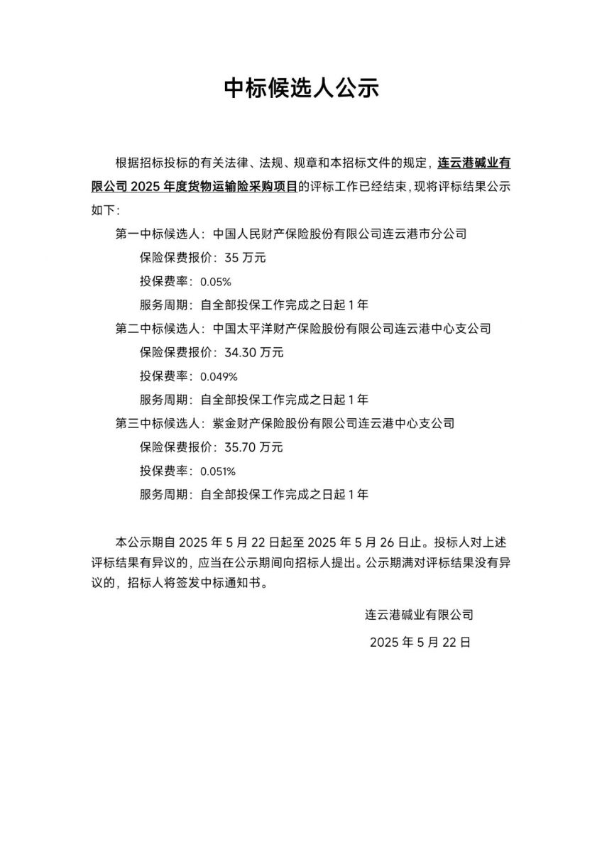 連云港堿業(yè)有限公司2025年度貨物運(yùn)輸險(xiǎn)采購項(xiàng)目中標(biāo)候選人公示