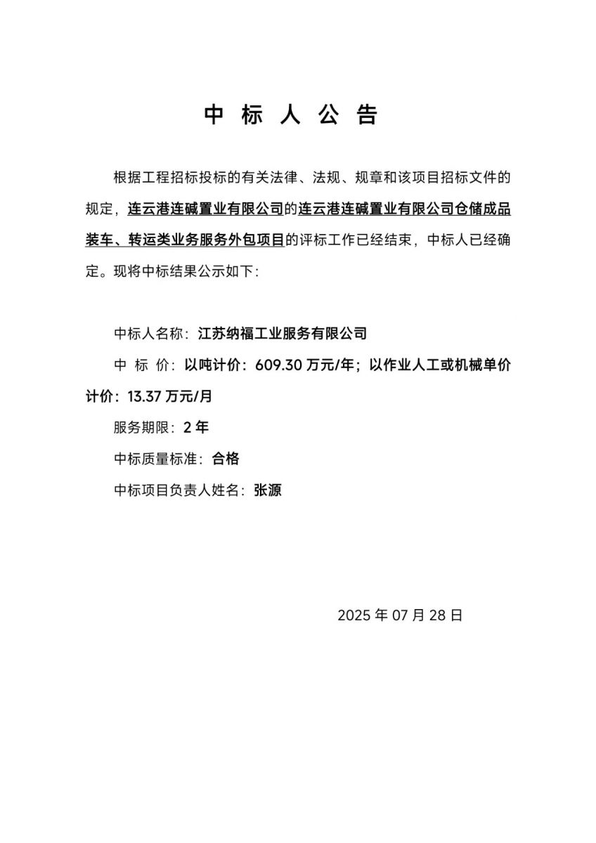 連云港連堿置業(yè)有限公司倉儲(chǔ)成品裝車、轉(zhuǎn)運(yùn)類業(yè)務(wù)服務(wù)外包項(xiàng)目中標(biāo)人公告