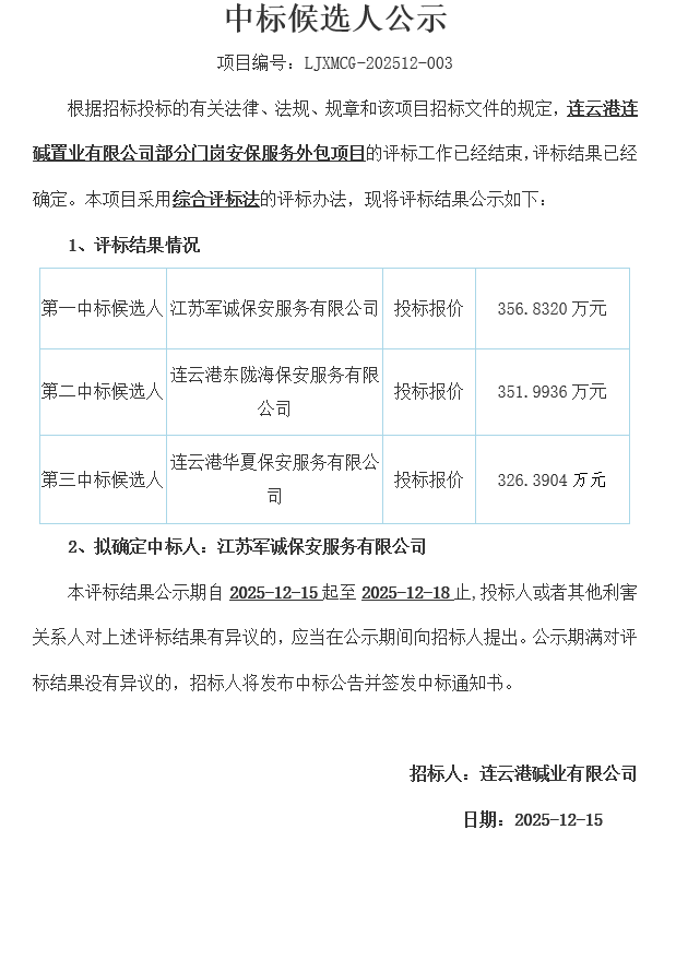 連云港連堿置業(yè)有限公司部分門崗安保服務外包項目中標候選人公示