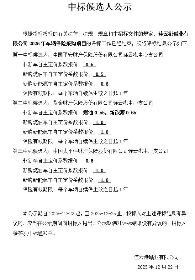 連云港堿業(yè)有限公司2026年車輛保險采購項(xiàng)目中標(biāo)候選人公示