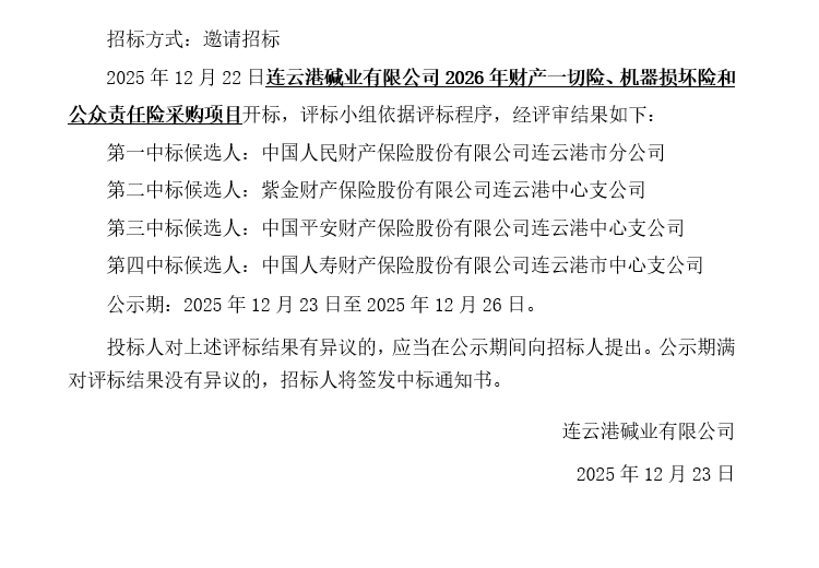 連云港堿業(yè)有限公司2026年財產(chǎn)一切險、機(jī)器損壞險和公眾責(zé)任險采購項目中標(biāo)候選人公示