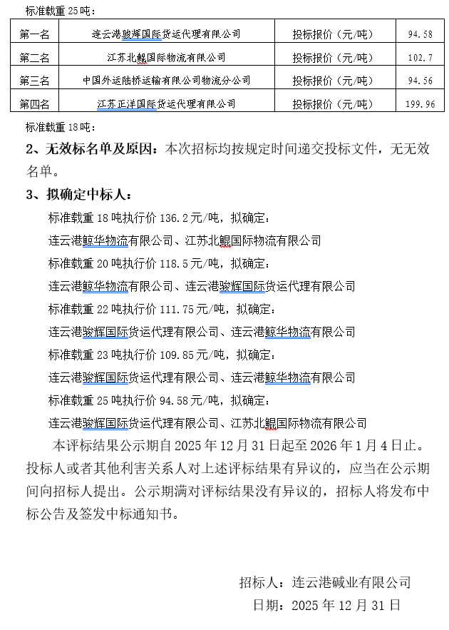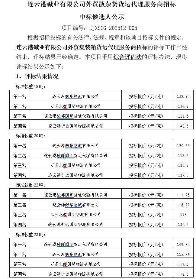 連云港堿業(yè)有限公司外貿(mào)集裝箱貨運(yùn)代理服務(wù)商招標(biāo)中標(biāo)候選人公示