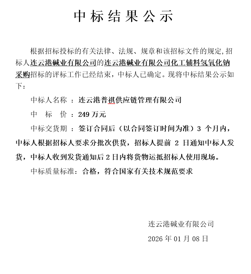連云港堿業(yè)有限公司化工輔料氫氧化鈉采購中標結果公示