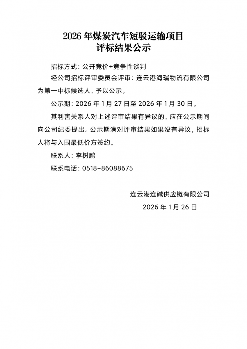 2026年煤炭汽車短駁運輸項目評標(biāo)結(jié)果公示