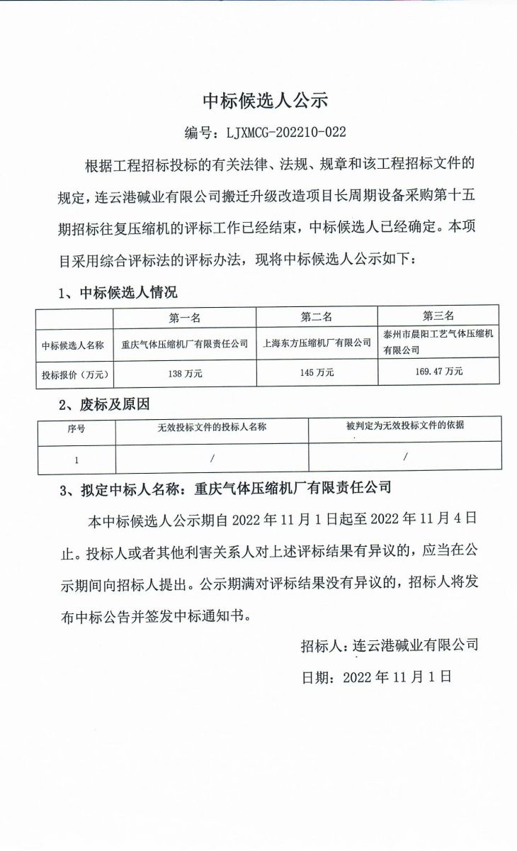 往復(fù)壓縮機(jī)采購招標(biāo)中標(biāo)候選人公示