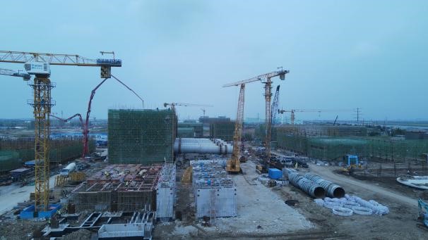 ⑸合成氨二標(biāo)段271原料煤儲運(yùn)破碎樓三層澆筑;#1轉(zhuǎn)運(yùn)站五層腳手架搭設(shè),鋼筋綁扎;#2轉(zhuǎn)運(yùn)站三層腳手架、模板拆除,四層腳手架搭設(shè),鋼筋綁扎,支模;汽車卸煤區(qū),煤筒倉外側(cè)土方土方挖取,圍檁安裝;820合成氨循環(huán)水站清凈廢水池鋼板樁拔除;塔下水池1支撐架搭設(shè),鋼筋綁扎;塔下水池2支撐架搭設(shè),對拉螺栓割除;吸水池1基坑開挖準(zhǔn)備;711煤漿制備二層腳手架搭設(shè),梁板柱支模,鋼筋綁扎,埋件安裝;762壓縮機(jī)廠房基礎(chǔ)短柱防腐;剩余設(shè)備基礎(chǔ)鋼筋綁扎,模板支設(shè);763空分后備系統(tǒng)上部結(jié)構(gòu)鋼筋綁扎,預(yù)埋件安裝,支模;764儀表空壓站基礎(chǔ)墻防腐;831空分變電所首層結(jié)構(gòu)鋼筋綁扎,埋件安裝,支模;761冷箱基礎(chǔ)冷箱設(shè)備帶板拼接施工;膨脹機(jī)房上部結(jié)構(gòu)鋼筋綁扎預(yù)埋螺栓安裝;712氣化框架立柱腳手架搭設(shè),鋼筋綁扎;灌注樁施工;樁基大小應(yīng)變檢測;基坑開挖準(zhǔn)備;塔吊附近承臺基坑回填;842空分機(jī)柜間板墻鋼筋綁扎;713渣水處理集渣池支撐架搭設(shè),鋼筋綁扎,支模;設(shè)備基礎(chǔ)錨固鋼筋焊接。
