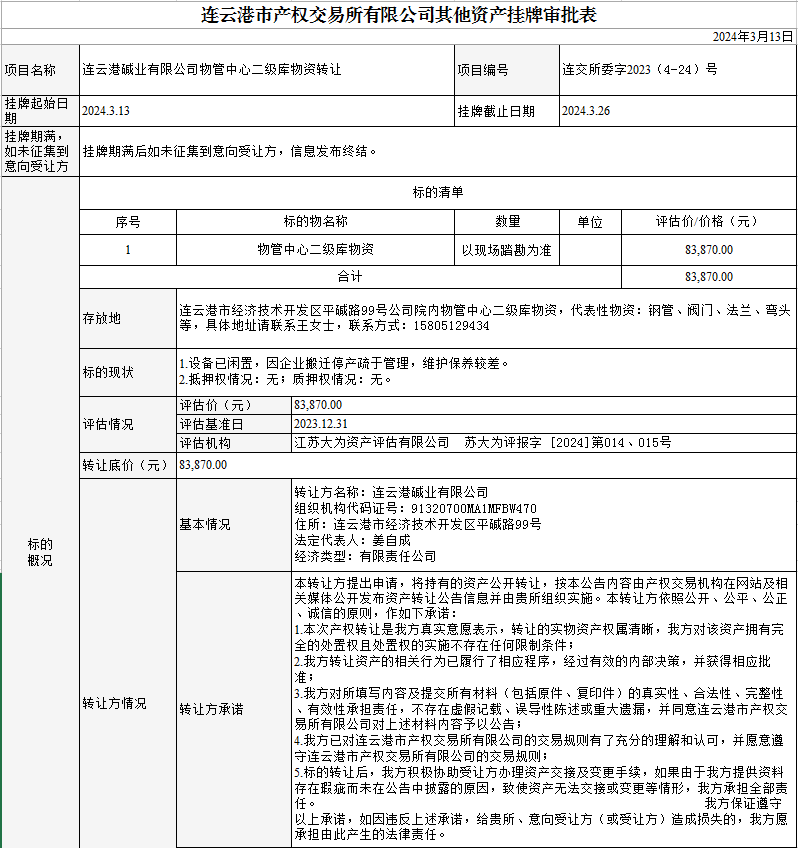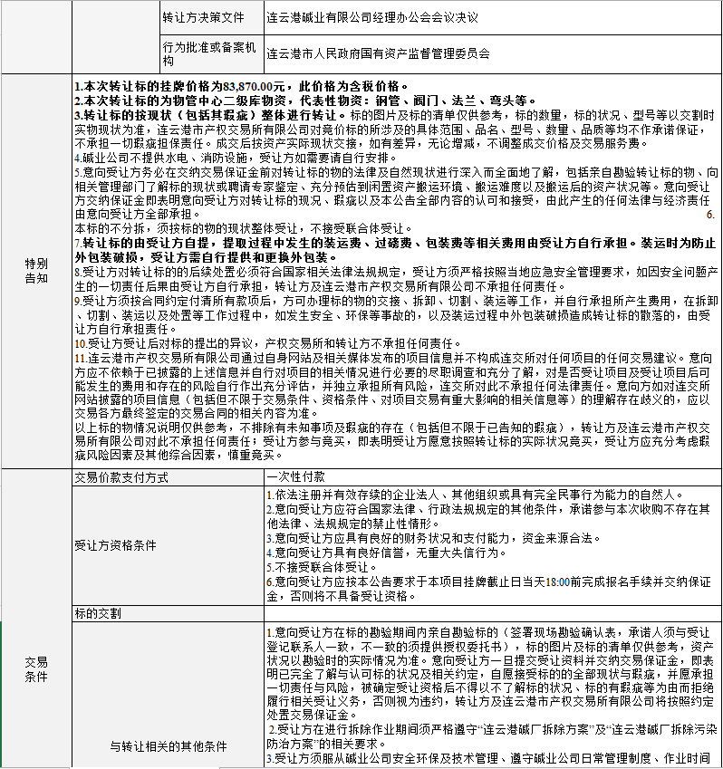 連云港堿業(yè)有限公司物管中心二級(jí)庫(kù)物資轉(zhuǎn)讓公告