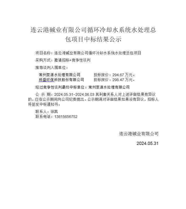 連云港堿業(yè)有限公司循環(huán)冷卻水系統(tǒng)水處理總包項(xiàng)目中標(biāo)結(jié)果公示