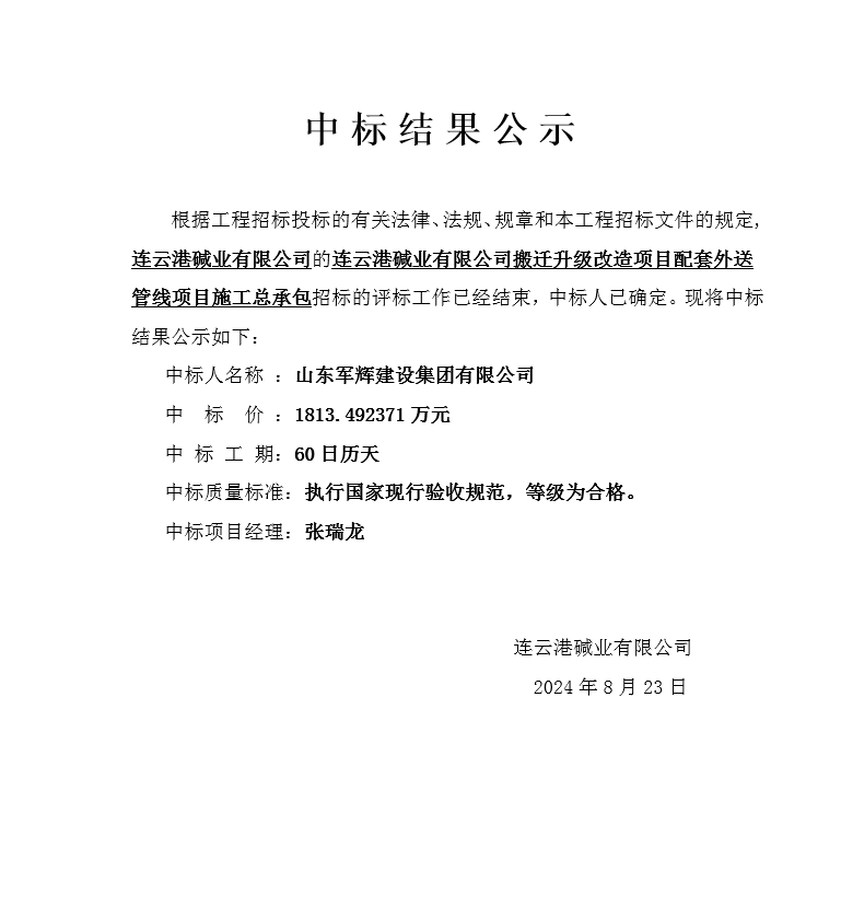 搬遷升級(jí)改造項(xiàng)目配套外送管線(xiàn)項(xiàng)目中標(biāo)結(jié)果公示
