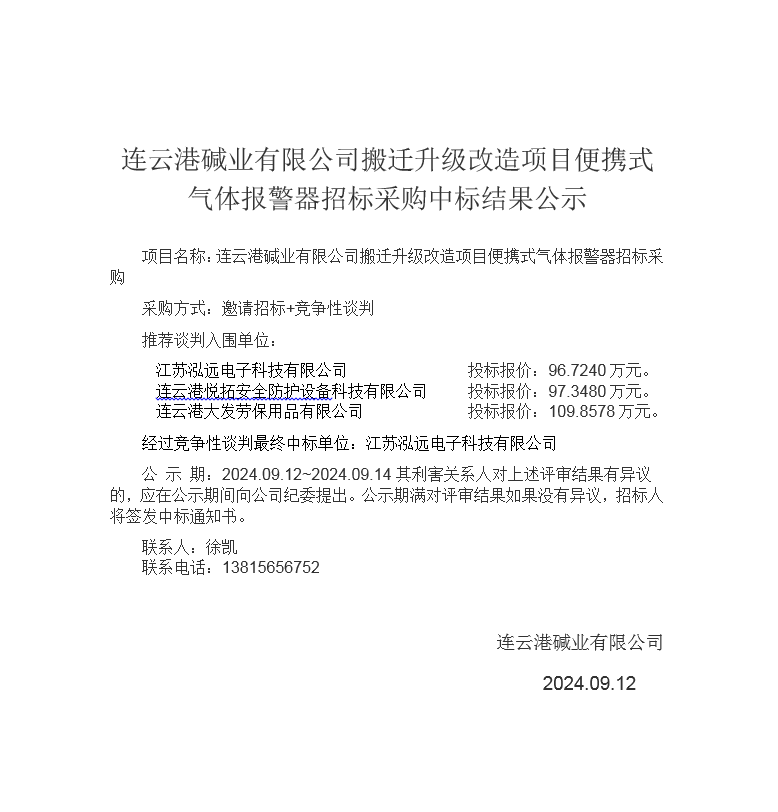 搬遷升級改造項目便攜式氣體報警器招標采購中標結(jié)果公示