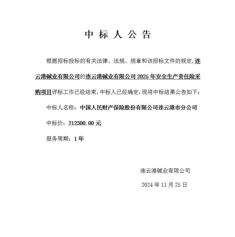 連云港堿業(yè)有限公司2025年安全生產(chǎn)責(zé)任險(xiǎn)采購(gòu)項(xiàng)目中標(biāo)人公告