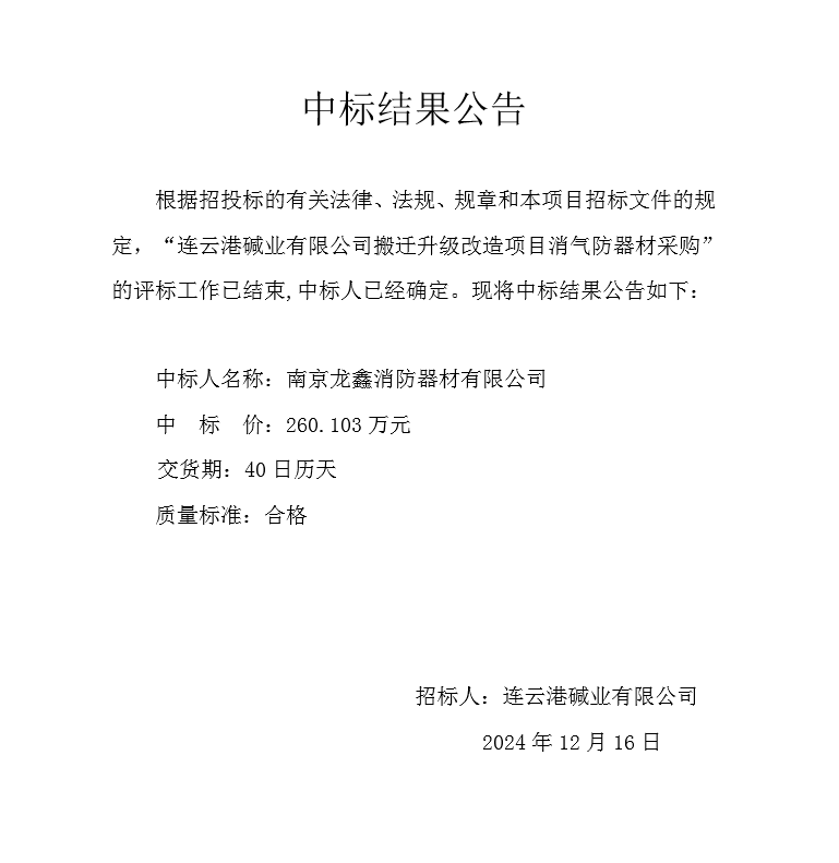 連云港堿業(yè)有限公司搬遷升級改造項(xiàng)目消氣防器材中標(biāo)結(jié)果公告