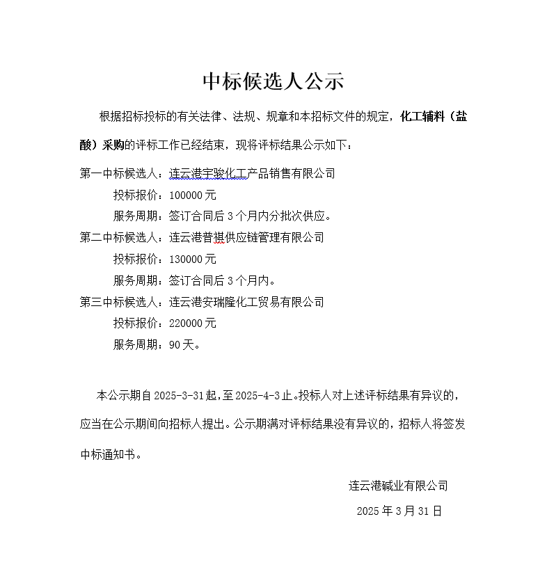 化工輔料鹽酸采購中標候選人公示
