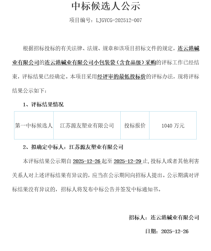 連云港堿業(yè)有限公司的連云港堿業(yè)有限公司小包裝袋(含食品級)采購中標(biāo)候選人公示