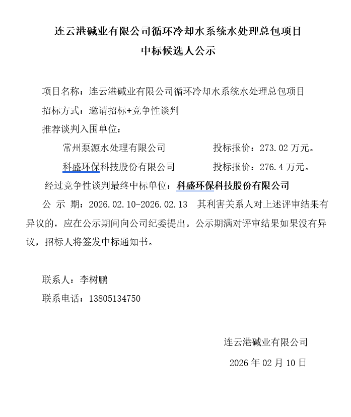 連云港堿業(yè)有限公司循環(huán)冷卻水系統(tǒng)水處理總包項目中標(biāo)候選人公示